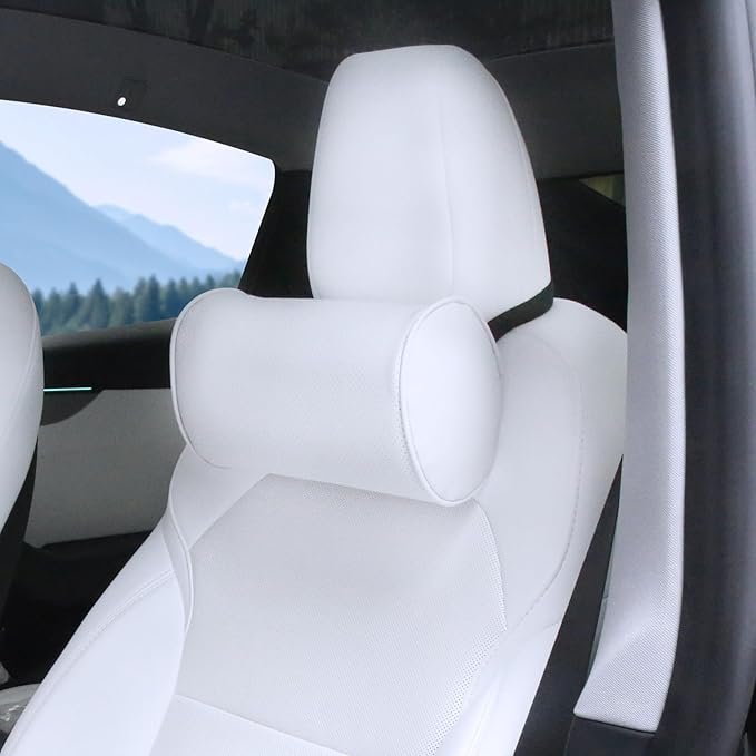 Car Headrest Pillow for Driving - Luxury Leather 100% Memory Foam, Ergonomic Neck Support - Universal Fit Head Rest Travel Pillow for Most Cars, Home & Office, White, 1 Pack