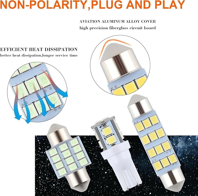- Wide Applicability: Festoon LED bulbs can be Interior map lights, dome lights, headlights, license plate light, parking lights, corner lights, trunk light, side marker lights, courtesy light, cargo light, trunk lights, stepwell lights, cosmetic mirror lights, door control lights etc. Easy to install, just plug and play.