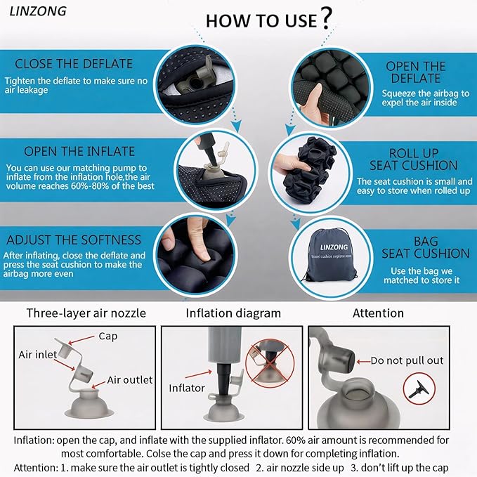 - Adjustable Comfort & Inflate Quickly: The accompanying inflation pump can quickly inflate the seat cushion. Fully opening the air valve can achieve rapid air release(Pro tip: 60-70% inflation for daily use, 40-50% during flights to counter altitude pressure changes)