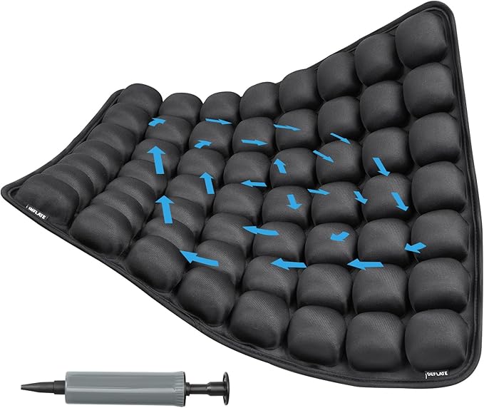 - Experience ultimate comfort with our inflatable seat cushion featuring a built-in pump for quick and easy inflation – perfect for airplane cushion for long flight, car cushion, or wheelchair pad!