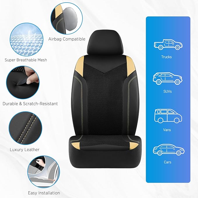 PIC AUTO Car Seat Cover, Super Breathable Mesh Front Seat Cover for Cars, Beige Leather Seat Covers, Universal Fit, Durable, Airbag Compatible, Suitable for SUVs, Trucks, Sedans, and Vehicles