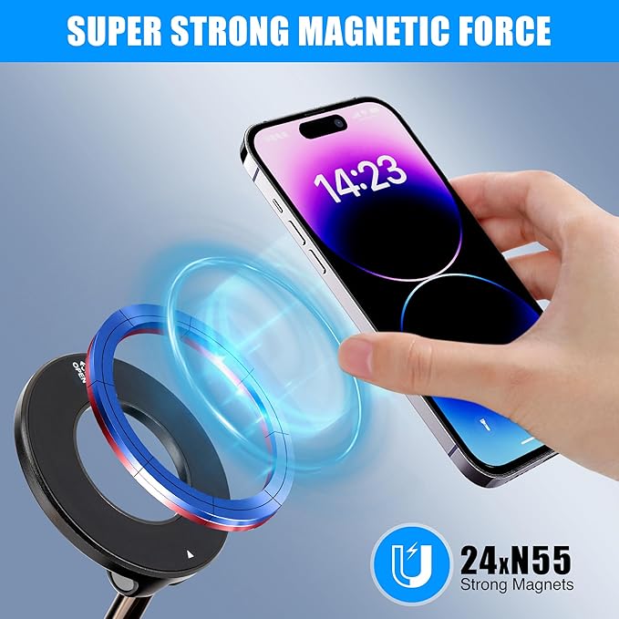 - ✅ [Supercharged Magnetic Force – 24 N55 Magnets, 2800gf Holding Power] - Built with 24 ultra-strong N55 magnets, the mount delivers 240% stronger attraction than standard models, capable of securing even heavy devices like iPhone 16 Pro Max. Passed through 6,000 vibration simulations, it ensures your phone never falls—while keeping GPS, signal, and MagSafe charging interference-free.