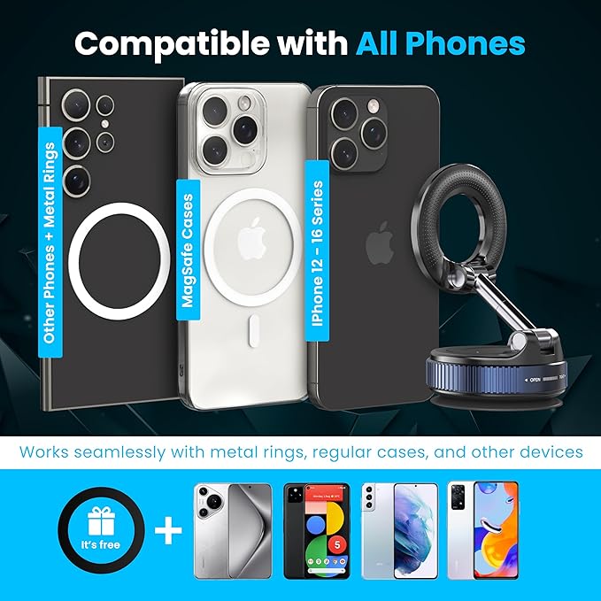 - ✅ [Wide Compatibility for MagSafe & Non-magsafe phones] - This MagSafe suction car mount is compatible with iPhone 16/15/14/13/12 series (Pro/Pro Max/Plus/mini), iPhone 11/XS/XR/8, and supports Samsung Galaxy S22/S21/S20/Note/A-series. Also works with MagSafe cases, magnetic phone cases, and most other smartphone brands. A must-have iPhone suction mount or magnetic holder for iPhone for reliable everyday use. A free magnetic ring is provided to use for the non-magsafe phones or cases.