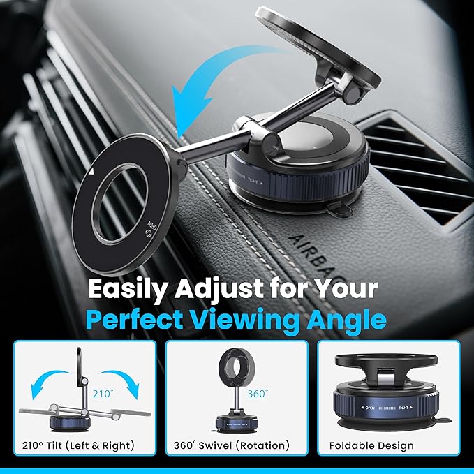 - ✅ [Military-Grade MagSafe Car Mount – Engineered for Stability & Precision]- Engineered with an upgraded vacuum suction cup, this suction cup phone mount delivers superior suction grip of 98 lbs through a manual twist-lock system. Unlike sticky mounts, this magnetic suction phone mount offers a residue-free quick release and can be repositioned anytime. The more your car shakes, the tighter the vacuum magnetic phone holder locks in—making it the perfect suction phone holder for car.