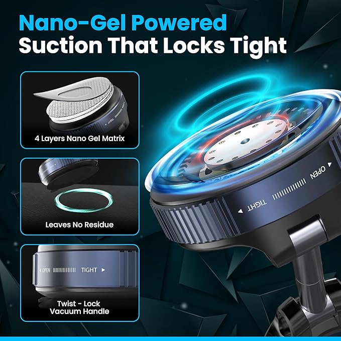 - ✅ [Upgraded Vacuum Suction Cup – Rock-Solid on Any Road] Featuring reinforced rotating-lock vacuum suction technology, this mount delivers 65% stronger suction than standard mounts and holds firm even on bumpy roads, sudden stops, or sharp turns. With extreme temperature resistance and 9,000+ suction tests, it guarantees long-lasting reliability.