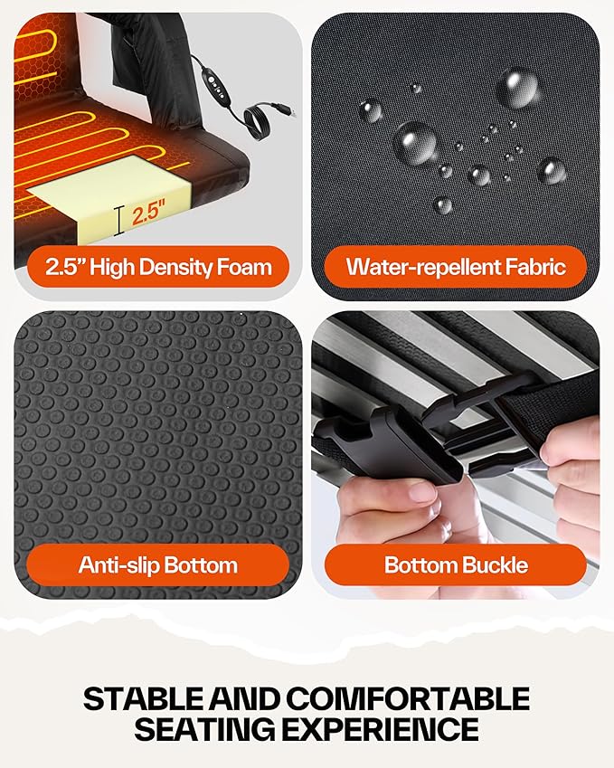 - Thickened & Soft Cushion: Say goodbye to hard stadium seats. The Sportneer heated bleacher seat features a strong steel frame, a 2.5" high-density foam cushion, and a 16" high backrest for maximum comfort and reliable support. Padded armrests on both sides add extra comfort, making every game or event a more enjoyable experience.