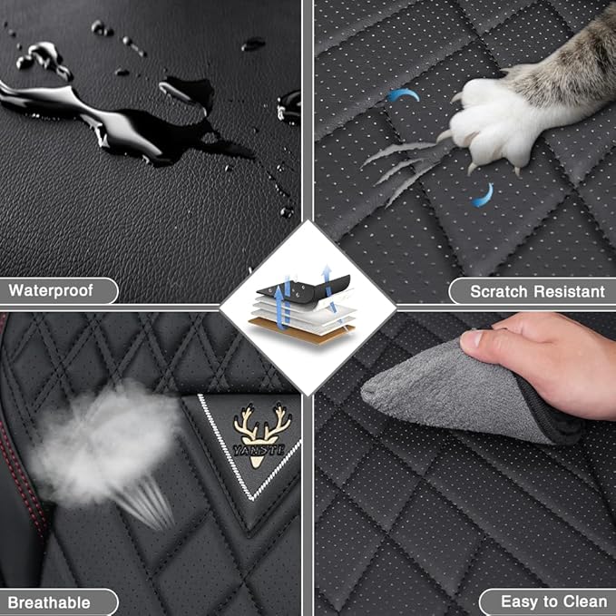 - 【SUPERIOR FAUX LEATHER QUALITY】: Made from top-grade faux leather, our seat covers boast exceptional quality, durability, and resistance to wear. They not only enhance seating comfort but also provide a waterproof barrier, protecting your car seats from spills, stains, and everyday wear and tear.