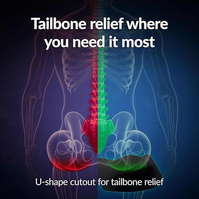 - TARGETED RELIEF & FULL BODY SUPPORT: The ergonomic upgraded design on our premium cushions alleviates tailbone and lower back pain, supporting spinal alignment; A seat cushion can relieve pain over time, especially when used for pressure relief or support during after surgery recovery. Our desk chair cushion has an ergonomic butterfly shape that minimizes tailbone and lower back pain, supporting correct spinal alignment and offering hip and legs support for office chair use