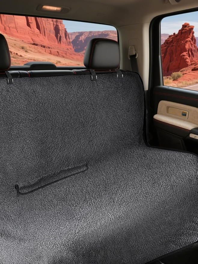 - Durable 3-Layer Construction: Front: Soft, black towel cloth for a sleek look and superior durability. Middle: Waterproof, moisture-wicking fabric that protects your seats from sweat, spills, and accidents. Back: Non-slip backing that ensures a secure fit, keeping the cover in place even during long trips.