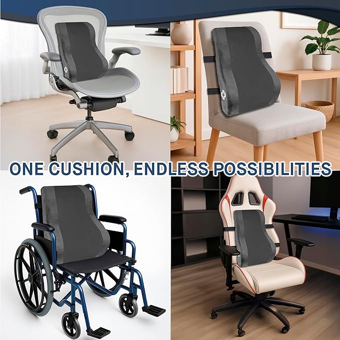 - MULTIFUNCTIONAL & ADJUSTABLE: Featuring an adjustable strap for easy attachment, this lumbar support pillows is perfect for use in the office, at home, during road trips, or on airplane seats. It’s also an excellent addition to wheelchairs for enhanced comfort, and gamers appreciate the extra support it provides during long gaming sessions. No matter the terrain, the lumbar support pillow for chair stays securely in place during car journeys, making it a versatile choice for all. Ideal for recliner lumbar support, this pillow adapts to various seating needs.