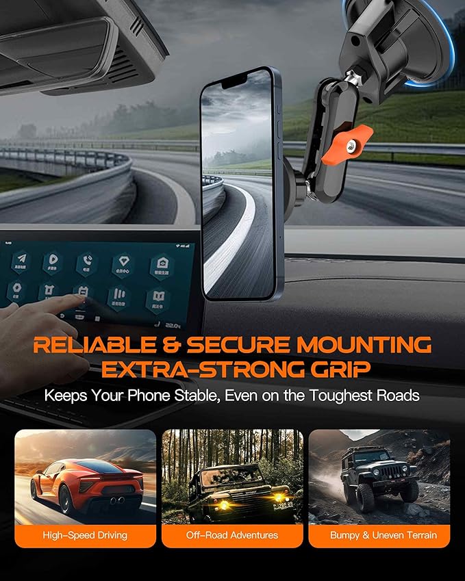 - SUPER DURABLE: Features an upgraded high-quality metal center arm, offering exceptional strength, durability, and a premium finish; Paired with an ultra-durable vacuum suction cup, it delivers a rock-solid hold and long-lasting performance without leaving any residue; Note: The vacuum suction cup works best on smooth surfaces such as glass; Avoid using on leather, matte, or textured surfaces to ensure a secure hold