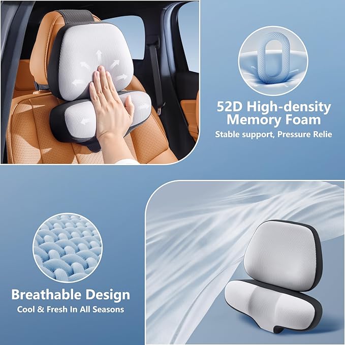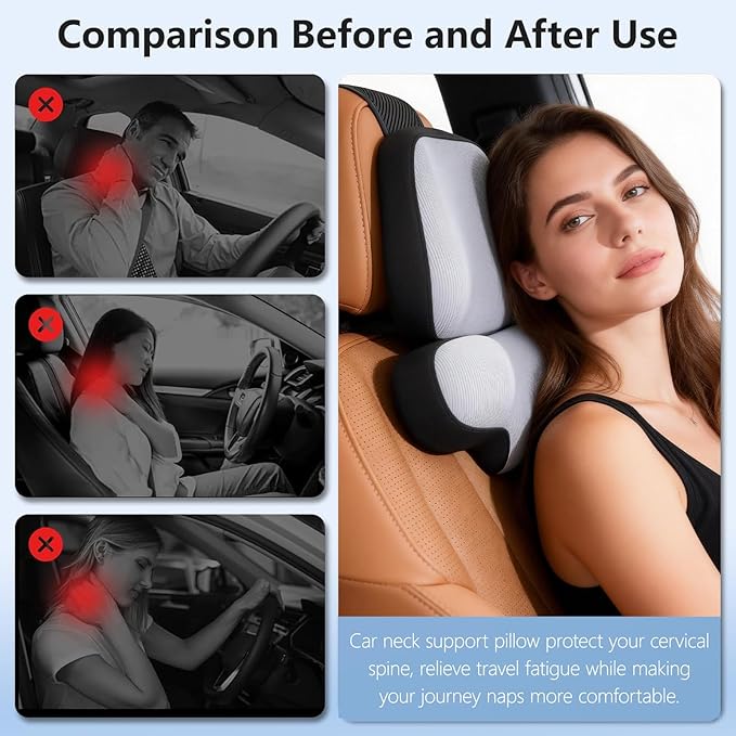 - Ergonomic Neck Pillow with Memory Foam - Triple ergonomic support design to reduce the gap between the neck and shoulders and the seat, provide good support for your cervical spine and head, help you maintain a correct driving posture. Effectively relieving the acid, fatigue, swelling, pain caused by long-distance driving, making driving more comfortable and comfortable.