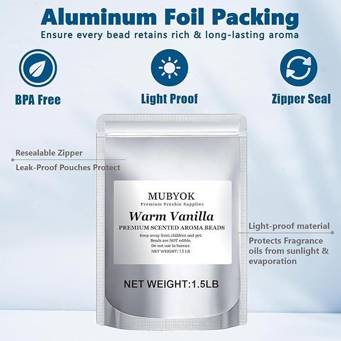 - Superior Packaging & Long-Lasting Scent:Our Scented Aroma Beads are carefully sealed in premium aluminum foil bags, designed to lock in fragrance and freshness. These UV-blocking, leak-proof pouches protect essential oils from sunlight and evaporation, ensuring that every bead retains its rich, long-lasting aroma. With our heat-sealed, mess-free packaging, you get a premium, hassle-free scent experience.