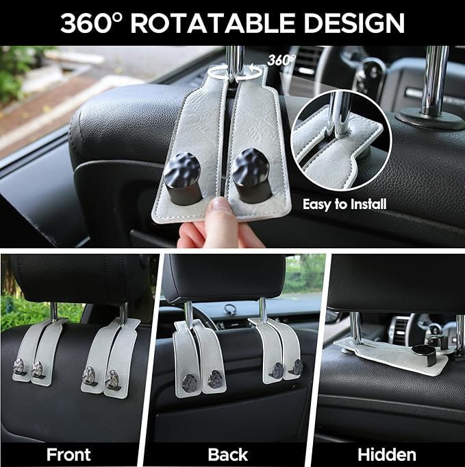 - 2. 360° ROTATION & HIDDEN STORAGE - Headrest hooks for car, can rotate hooks to front/back seats for easy access. Tuck hooks under headrest when unused to save space and prevent snagging, no more scratched hands.