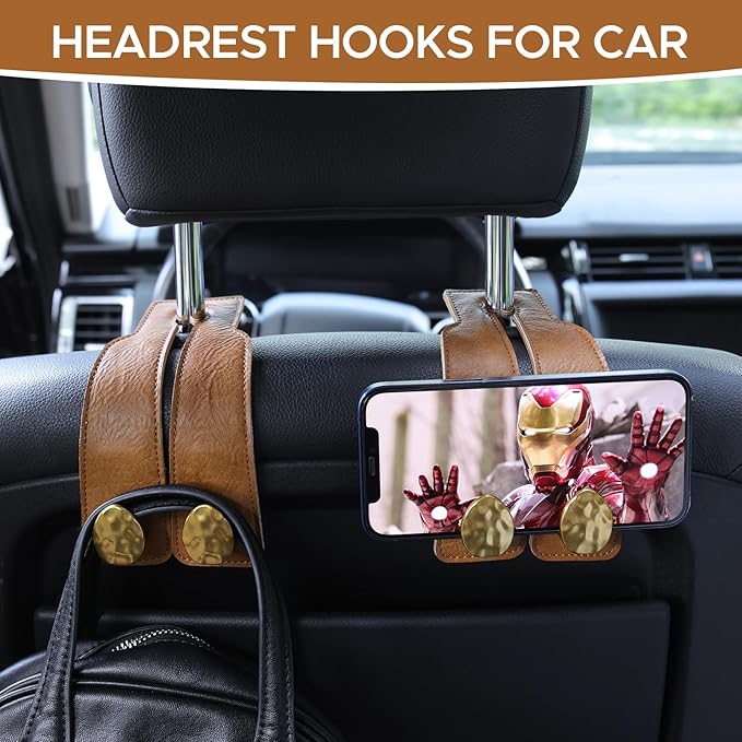 - 1. PREMIUM MICROFIBER LEATHER & METAL HOOKS - Car headrest hook is crafted with wear-resistant microfiber leather, and reinforced metal double hooks. Can hold 55 lbs without breaking or deforming. Wear resistant and durable.