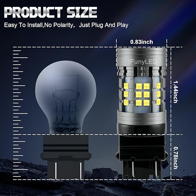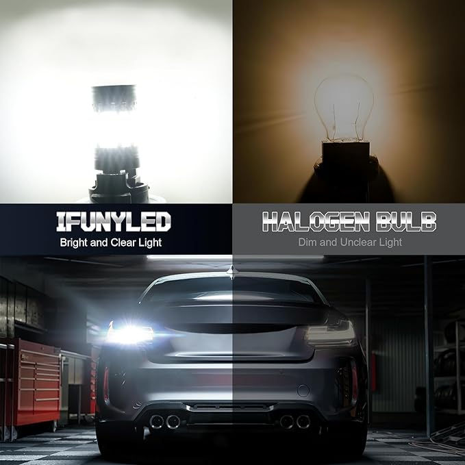 - 400% Brighter than Halogen: iFunyLed 3157 led light is built with 36 pieces of 2525 high brightness led chips per bulb, generating 3440lm super bright output per pair. Being able to help others notice your vehicle faster and more clearly even in poor lighting conditions.