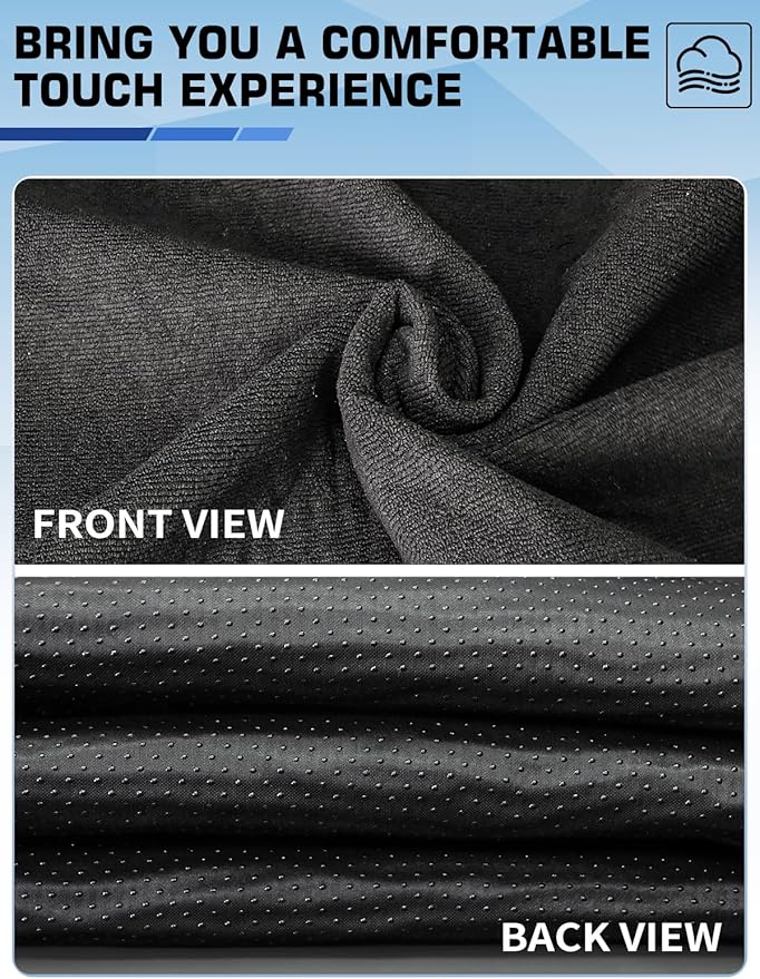 - 3. Thickened 3-Layer Heavy-Duty Construction Front: Soft yet durable black towel cloth with a sleek finish and enhanced thickness for long-lasting use. Middle: Premium waterproof fabric that blocks spills, sweat, and moisture effectively. Back: Non-slip backing keeps the cover firmly in place, even during rough rides or long trips.