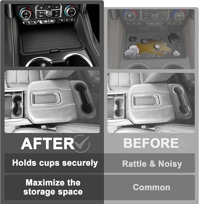 - Function: Creates additional storage without taking up extra space – Maximize your center console by utilizing unused vertical space, allowing you to store more items neatly and efficiently. Plus the cup holder inserts are easy to clean, effortlessly keeping your cup holder area tidy. Provide full protection for your interior against scratches and damage