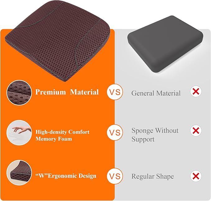 - Ergonomic Car Cushion - Our seat cushion for car seat driver provides maximum support and comfort for your back and hips. Besides, our cushion could help form a correct posture to relieve fatigue or pain caused by sitting too long. The W-shaped seat cushion for car can closely fit the curve of your legs for comfortable driving