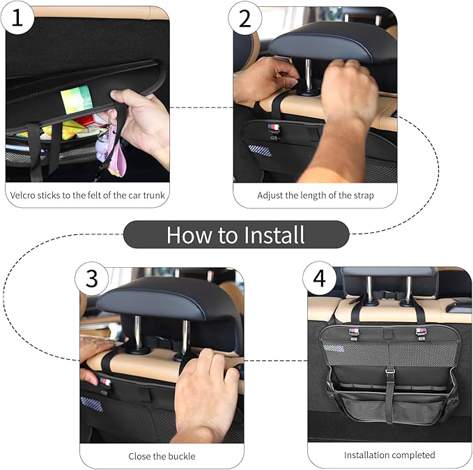 - MOUNTING OPTIONS: Viaviat car storage bag features adjustable non-elastic straps and velcro backing for secure installation either in trunk or on car seat headrests.
