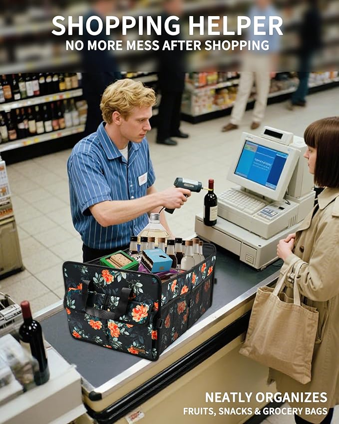 Sturdy Car Trunk Organizer β Large Capacity Trunk Organizer for SUVs & Sedans, Hard-Shell One-Piece Design with Cute Print, Collapsible and Durable Car Organizers (Flower 70L)