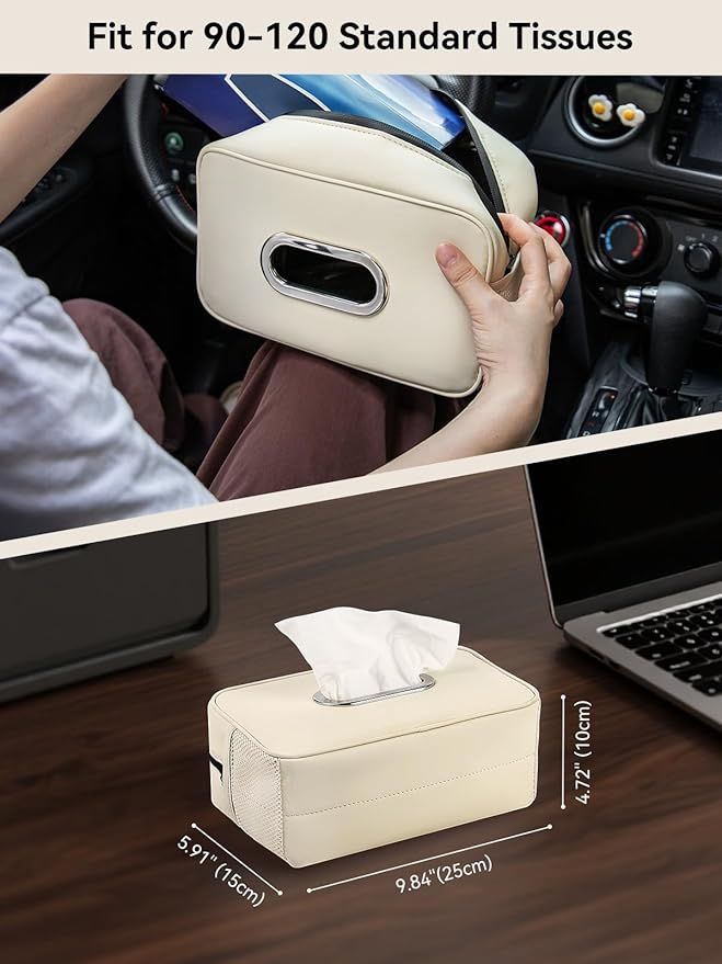 - 【Large Capacity & High-quality】Thetissue box holder is made of Premium PU Leather, which is waterproof and soft-touch high quality material, very easy to clean and will not easily wet the tissues inside the tissue box. Moreover, This car kleenex holder's capacity is compatible with the 150 tissue boxes, without taking the tissue out of the box. Rectangular box with dimensions of 9.84" × 5.9" × 3.9".(Note:Our tissue box's foldable when not in use help you save space and keep tidy)