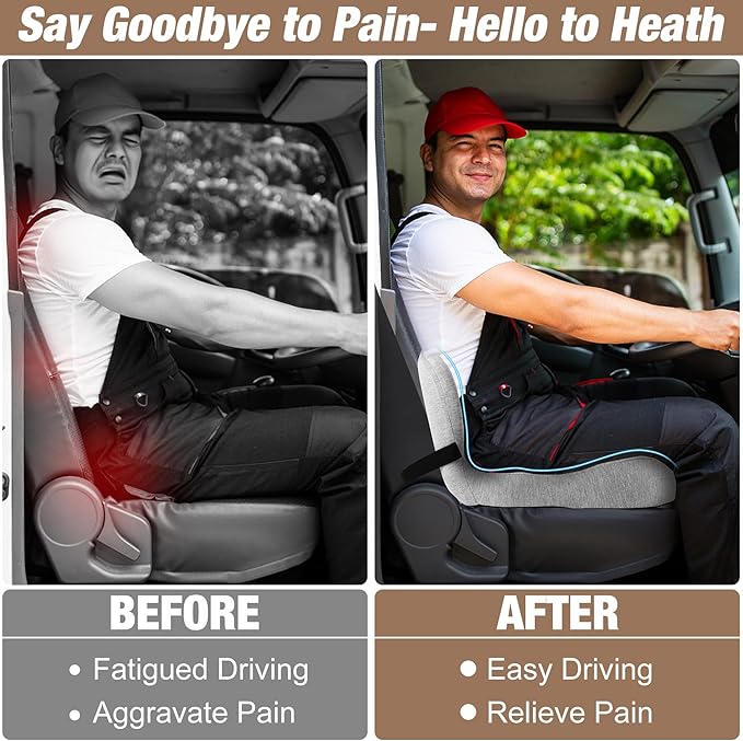 - 【Ergonomic Design】L-shaped memory foam seat cushion structure that conform to natural curvature of the spine. Seat cushion for truck driver is 17.3'' L and 16.5'' W, equipped with 12.6'' of lumbar support, suitable for most seats. Effectively relieve soreness and fatigue in the waist, buttocks and coccyx, providing all-day comfort for long driving