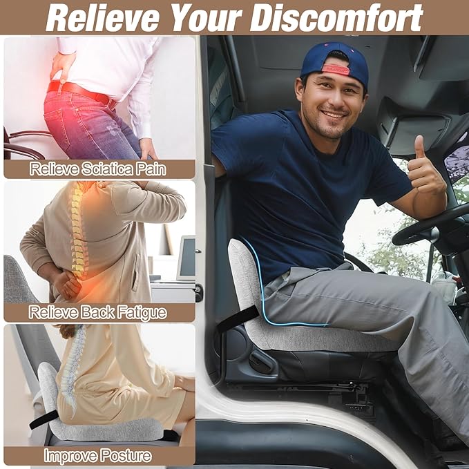 - 【Wide Application】The size of the memory foam seat cushion for truck driver is very versatile, fitting most truck seats perfectly. Meanwhile it also can be used with office chair, home chair, gaming seats, wheelchairs and any other types of chairs. It's lightweight so that you can take it to your office or home easily