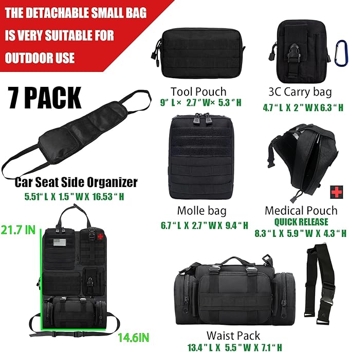 - Package included:1*tactical molle seat back organizer,1*Tactical Molle Bag,1*Tool pouch,1*Cell Phone Pouch,1*Medical Pouch,1*Multipurpose Waist Pack.1*Removable shoulder strap.1*biner.Can protects your seat from scratches and stains.