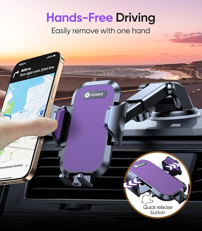 VICSEED Purple Phone Holders for Your Car [Upgraded True Military-Grade Strongest Suction] Cell Phone Mount for Car Dashboard Windshield Vent Truck Boat Stand Adjustable for iPhone Android