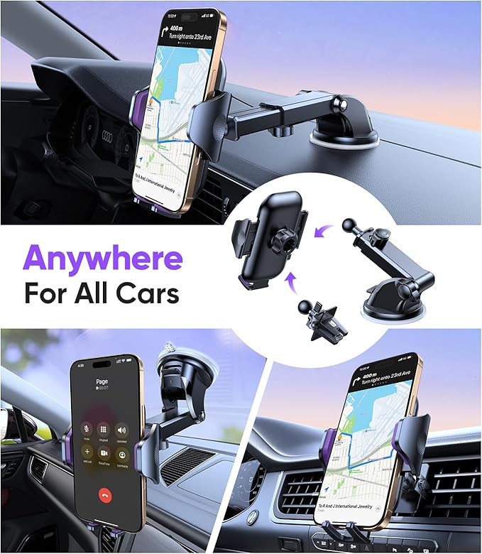 - [Super Strong Suction – No Falling, No Marks] 2025 upgraded car phone mount features a military-grade suction cup that holds 95+ lbs on your dashboard, windshield, or air vent. Unlike cheap mounts that melt or leave sticky residue, it leaves no residue and resists heat from -40°F to 194°F. Perfect for SUVs, trucks, taxis, and all cars, making it the most secure phone mount for car.
