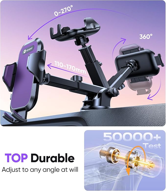 - [360° Adjustable – Perfect View, Zero Wobbling] With a 360° rotating head & 270° telescopic arm, position your phone vertically or horizontally for GPS, calls, or music. This phone mount for car stays rock-solid, even on bumpy roads. No more distractions—just safe, hands-free driving.