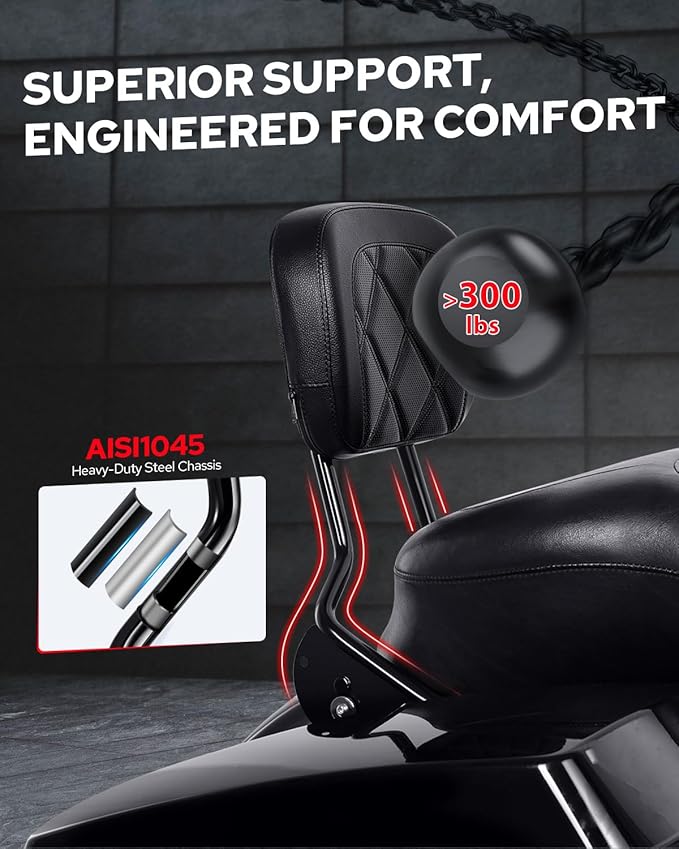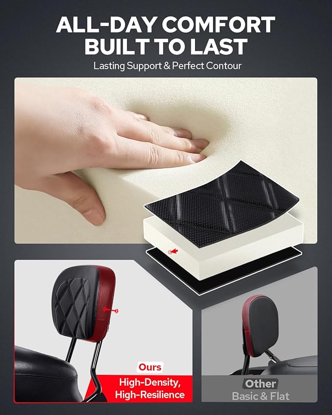 - 【PU LEATHER & SOFT FOAM】The detachable sissy bar backrest combines premium PU leather with thick, high-density U-shaped foam to provide a snug fit and targeted lower back support. Engineered for maximum comfort, it helps reduce fatigue and makes every ride more enjoyable