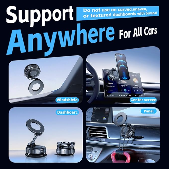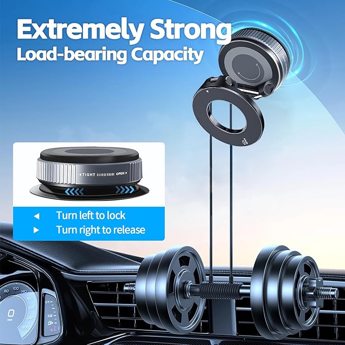 - 【Super Strong Magnet】The car phone mount features an upgraded, enhanced suction cup at the base with the latest vacuum adsorption technology,Simply twist the dial to secure it firmly on flat surfaces like leather dashboards, windshields, center consoles, or side windows. Delivers 80% stronger hold than traditional push-style mounts, staying rock-solid,holding phones even on bumpy roads.