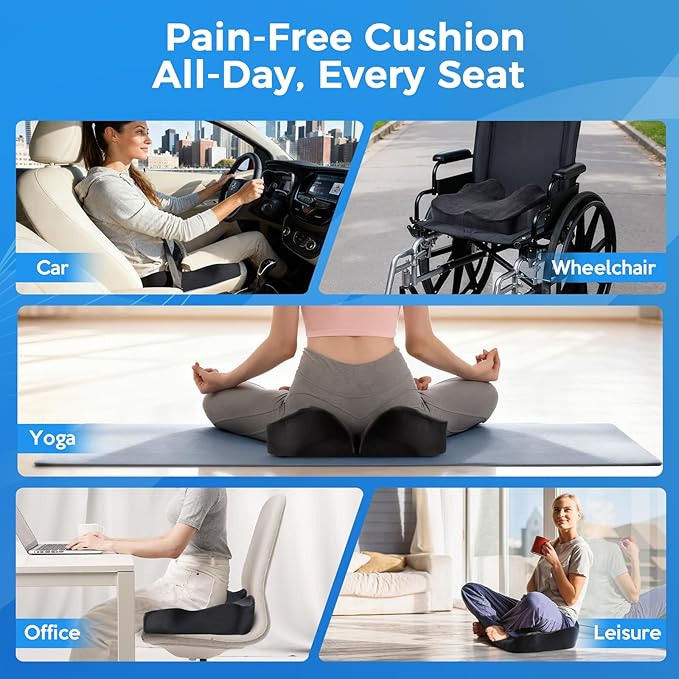 - 【Tired of Numb Hips and a Stiff Back?】This premium seat cushion features certified high-density memory foam that maintains its shape for lasting support. Ideal as a chair cushion, car seat cushion, office chair cushion, wheelchair cushion, or booster seat for kitchen chair, it fills gaps around your waist, hips, and thighs to fight muscle fatigue during long sitting periods. Wherever you sit—at your desk, on the road, or at home—this versatile seat cushion delivers the comfort and reliable support you need.