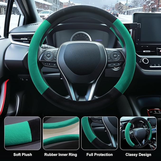 SEG Direct Steering Wheel Cover for Car, Standard Size 14.5-15 inch, Auto Interior Accessories, Warm Plush, Summer Winter, Black and Forest Green