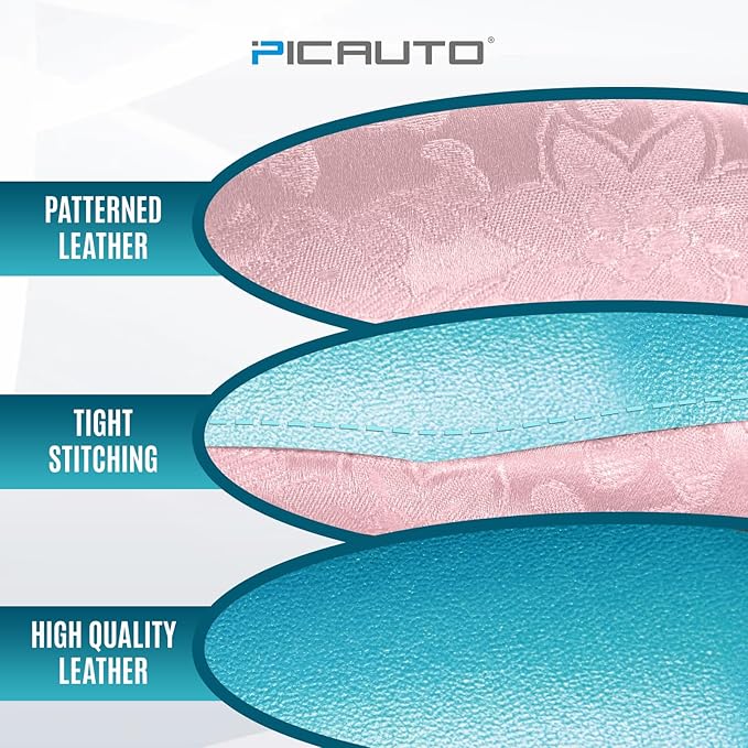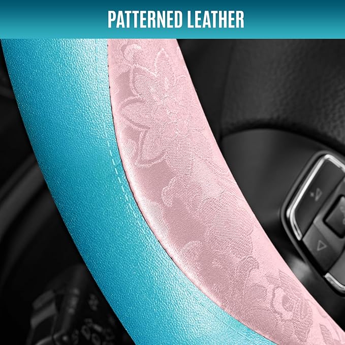 PIC AUTO Steering Wheel Cover, Pink Patterned & Blue Leather Patchwork Design, Universal Fit 14.5"–15.5", Anti-Slip, Odor-Free, Soft PU Grain Leather, Durable Grip Car Accessory for Girls & Women