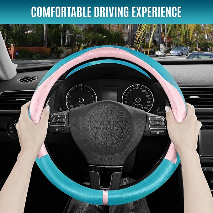 - STEERING WHEEL PROTECTION & SAFETY - Secure Driving Experience: The anti-slip inner lining keeps the cover securely anchored to your wheel, preventing shifting and improving control during steering maneuvers. Provides excellent heat resistance in summer and insulation in winter.