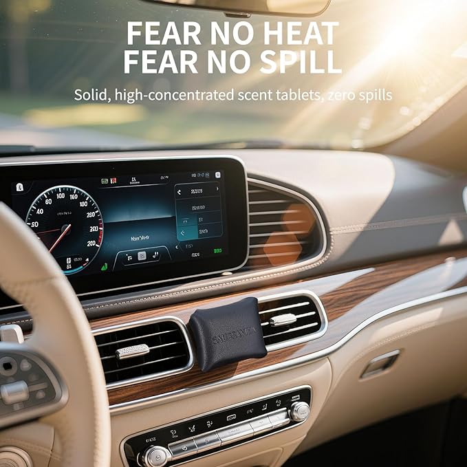 - 【HEAT-PROOF, LEAK-PROOF】No more sticky spills, just a perpetually fresh cabin. Our innovative solid-state design won't melt in a heatwave or harden on a chilly morning, ensuring reliable performance and lasting peace of mind. Tipps: Tear open the pouch and squeeze the fragrance pad directly into the leather case without touching it.