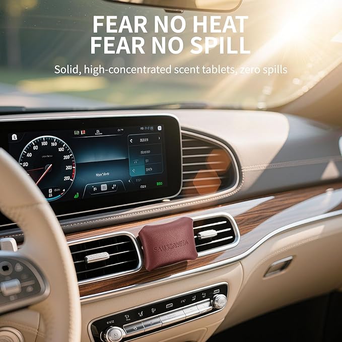 - 【HEAT-PROOF, LEAK-PROOF】No more sticky spills, just a perpetually fresh cabin. Our innovative solid-state design won't melt in a heatwave or harden on a chilly morning, ensuring reliable performance and lasting peace of mind. Tipps: Tear open the pouch and squeeze the fragrance pad directly into the leather case without touching it.