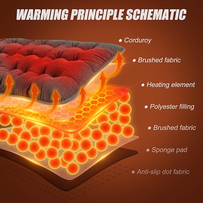 - Fast Heating with Stable Plug-in Power: This heated chair pad delivers quick and even warmth, reaching a comfortable temperature in about 1 minute to help promote blood circulation and ease fatigue from long sitting. A built-in thermostat and overheat protection help keep the temperature stable during use. The cushion is designed for reliable, continuous power when plugged into a wall outlet, making it ideal for home, office, or indoor use.