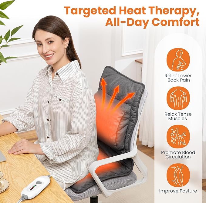 - Targeted Lumbar Pain Relief: Heated chair cushion is designed to target lower back pain, our office chair heating pad combines heat therapy with ergonomic support to soothe muscles and reduce tension, perfect for prolonged sitting of marathon work sessions, gaming. Outshines regular chair pads with superior comfort