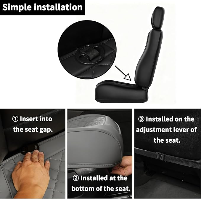 - Anti Slip Design: the bottom of the seat covers for trucks is made of anti slip gel material, which has outstanding anti slip property. In addition, the seat cover has a triple fixing design, with two metal hooks in the front, a strap buckle in the middle, and two plum blossom buckles at the back. Can firmly fix the seat cover on the seat.