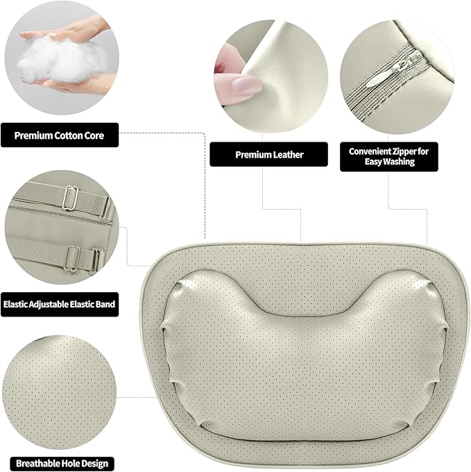 Car Neck Pillow [No More Pressure] Soft Comfortable Premium Leather Headrest with Adjustable Strap – Ergonomic Support for Driving, Office & Gaming, Off White (Beige), 2 Pack
