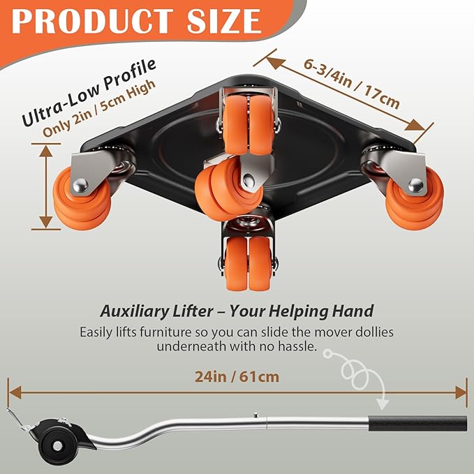 - LOW-PROFILE & EASY SETUP – At just 2 inches high, the dolly slides easily under furniture and appliances. Combined with the included furniture lifter tool, you can raise and position heavy items with minimal effort