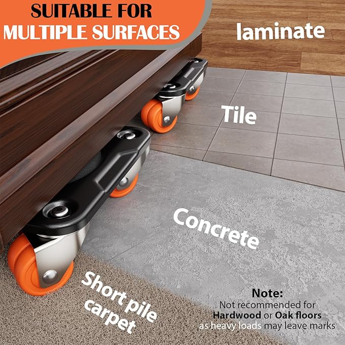 - VERSATILE ON MULTIPLE GROUND – Heavy duty furniture movers with PA double wheels roll smoothly on carpet, tile, epoxy, and concrete. For hardwood floors, use with care to avoid possible wheel marks when moving heavy loads