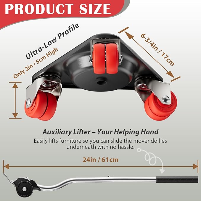 - LOW-PROFILE & EASY SETUP – At just 2 inches high, the dolly slides easily under furniture and appliances. Combined with the included furniture lifter tool, you can raise and position heavy items with minimal effort