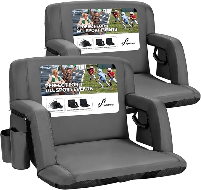 - Thickened & Soft Cushion: Say goodbye to hard stadium seats. The Sportneer stadium chair features a strong steel frame, a 2.5" high-density foam cushion, and a 16" high backrest for maximum comfort and reliable support. Padded armrests on both sides add extra comfort, making every game or event a more enjoyable experience.