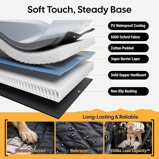 - 【3.0 Full Hard Bottom – 450lbs Load Capacity】:Tired of flimsy covers that collapse under your dog?Your dog deserves better!Our full hard-bottom design holds up to 450lbs and expands seat space by 145%, giving your pet a firm, safe area to relax—no slipping into seat gaps, no joint strain. Crafted with 6-layer premium waterproof and wear-resistant materials for long-lasting durability and all-weather protection.