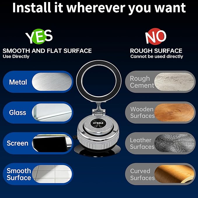 - 【Suitable for Smooth Surfaces & Designed for Mag-Safe】This vacuum suction car phone holder is designed only for completely smooth, non-porous surfaces such as glass or mirrors. For textured surfaces such as dashboard, use the included round PC pad. Steps: ①Clean the textured surface; ②Peel off the protective film from the pad; ③Press the pad firmly onto the installation area; ④Mount the phone stand onto the pad. In addition, this product is directly compatible with i Phone 17/16/15/14/13/12 devices. It also includes a magnetic ring for compatibility with other non-Mag Safe devices.